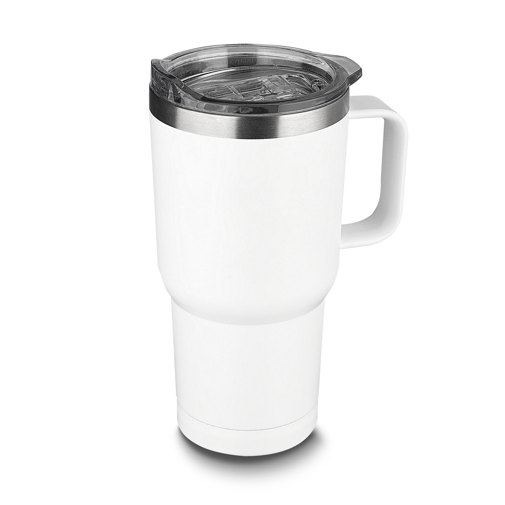 Caneca térmica em aço inox com parede dupla isolada à vácuo, tampa plástica e anel em silicone para vedação, alça lateral. Capacidade 600ml.