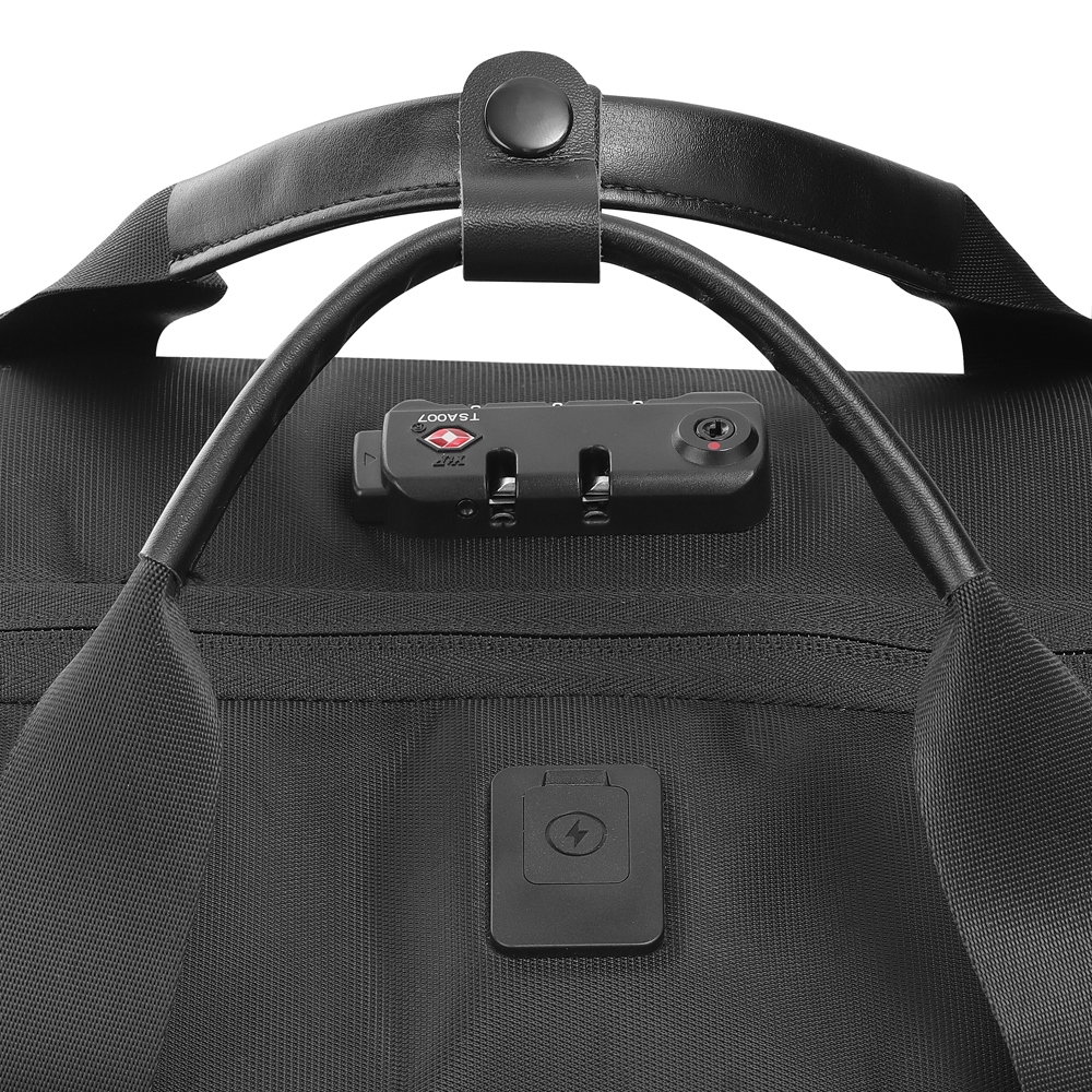 Mala executiva em poliéster, compartimento interno com zíper,  alça de ombro e mão, entrada usb, cadeado com senha/segredo, cadeado tipo TSA e compartimento para notebook de até 15,6″.